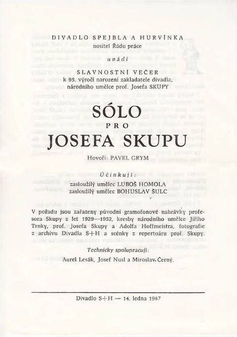 první provedení 3.9.1956 v Plzni, II. premiéra 31.12.1956 v Praze byla posledním vystoupením Josef Skupy