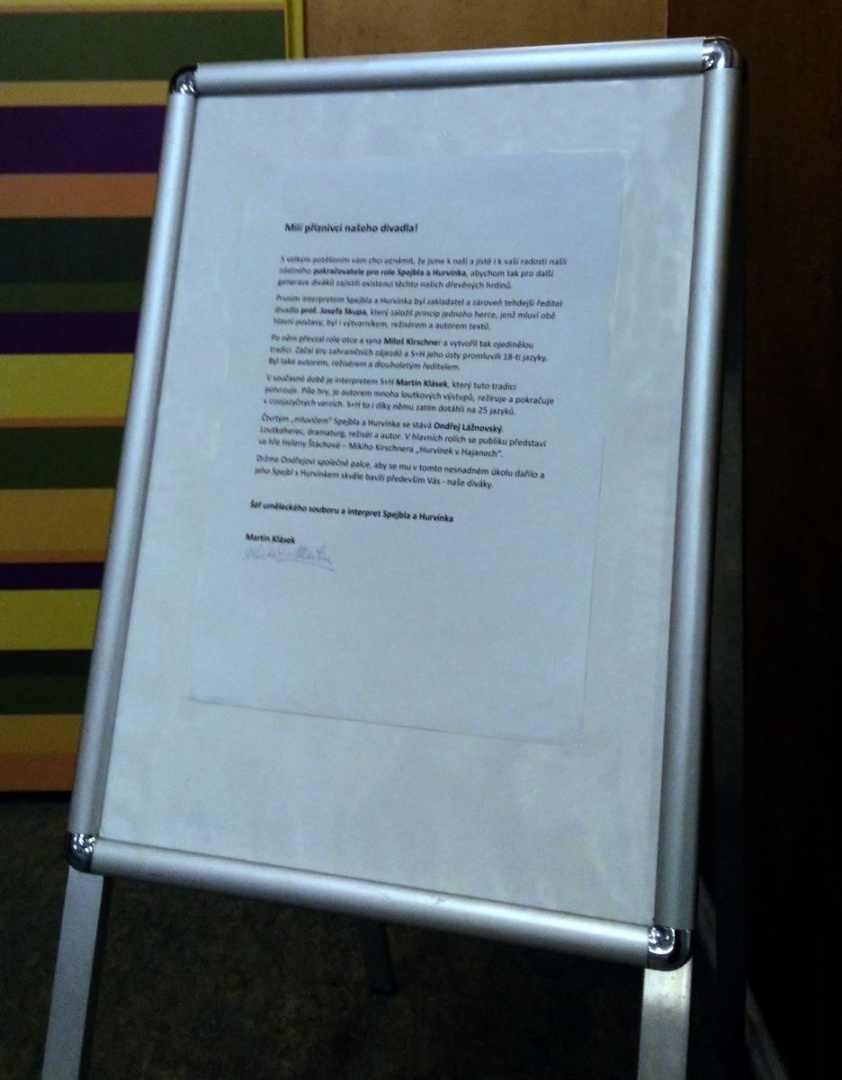 Začátkem října se totiž, v historii divadla již potřetí, v předsálí objeví oznámení současného interpreta Spejbla a Hurvínka – Martina Kláska, který divákům představí dalšího pokračovatele a v pořadí již čtvrtého interpreta S+H.