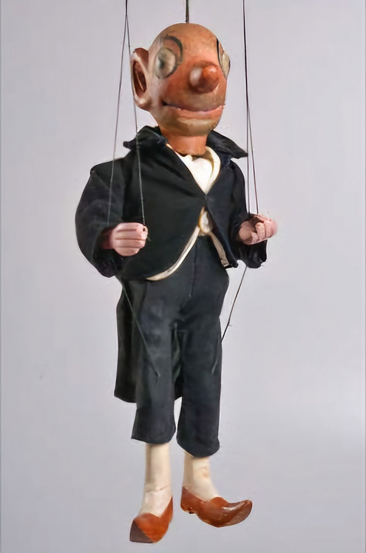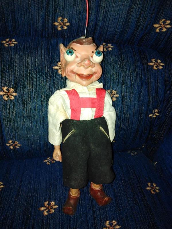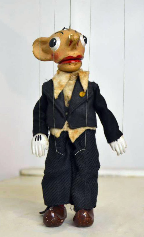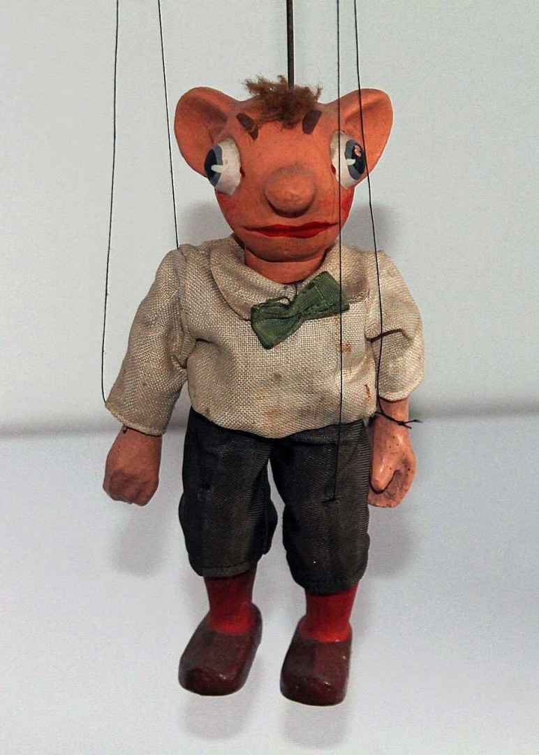 Hračkový Hurvínek (loutka s výkyvnou hlavou a pohyblivými údy), vyráběná od roku 1949 z trvanlivé hmoty podle návrhu akademické malířky a sochařky Marie Borkové-Fischerové.