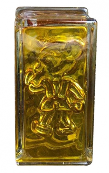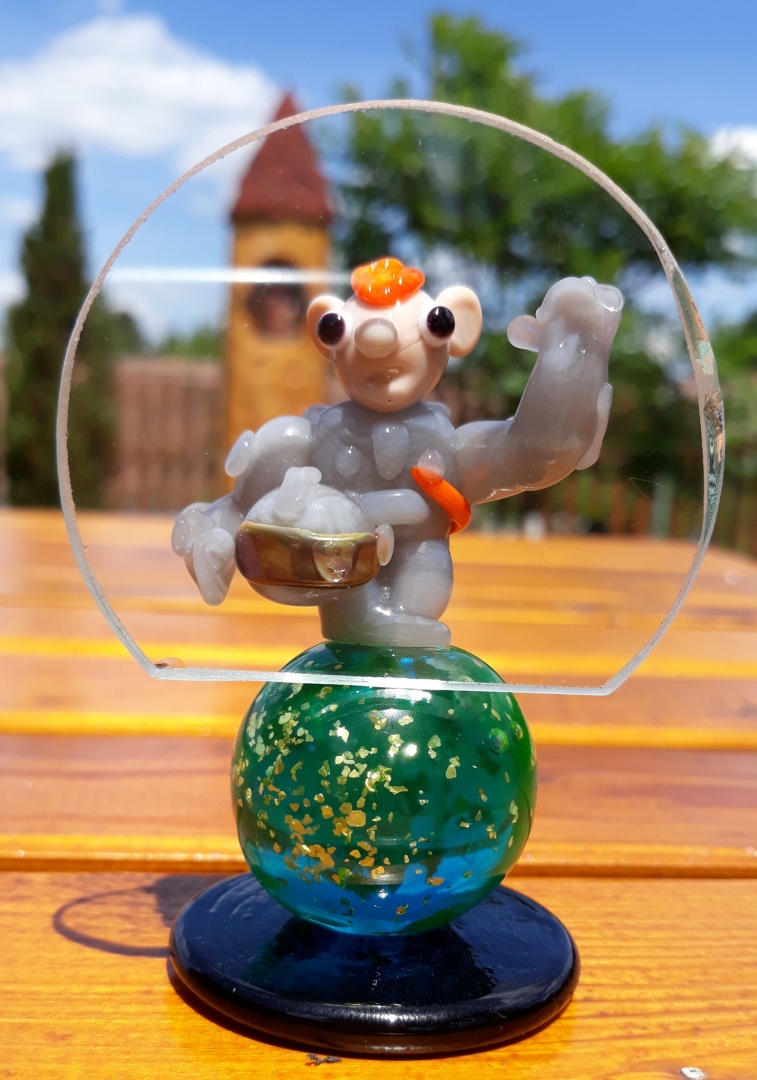 Neprodejná skleněná figurka Hurvínka zhotovená jako připomínka cesty do vesmíru (výrobce: Miroslav Košler, Vícemil, 2022)