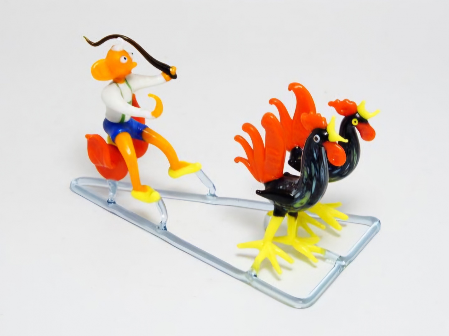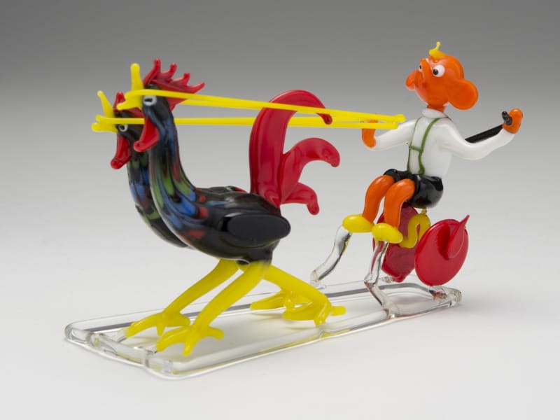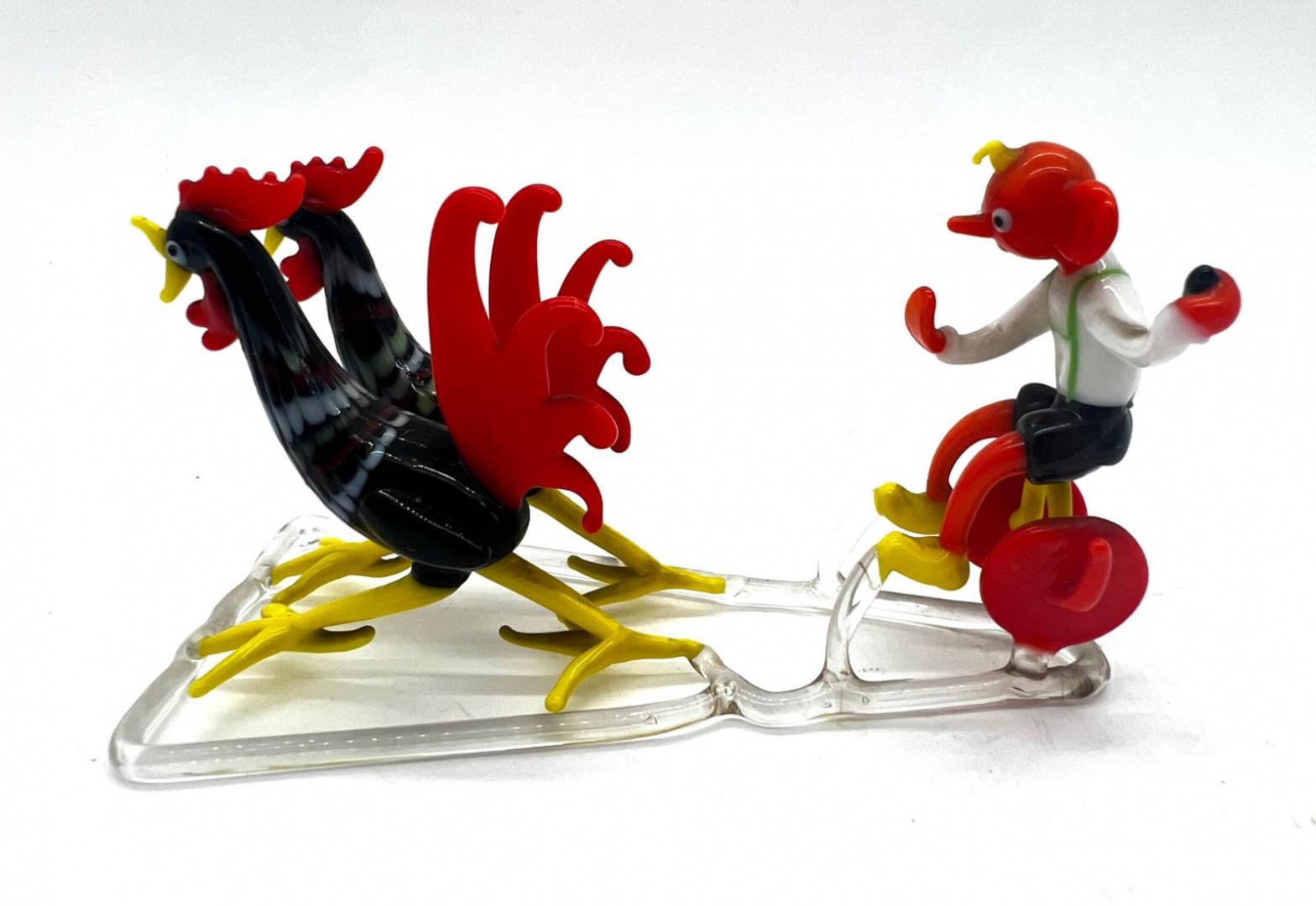 Skleněná figurka Hurvínka s kohoutím spřežením (J. Brychta, cca 1955)