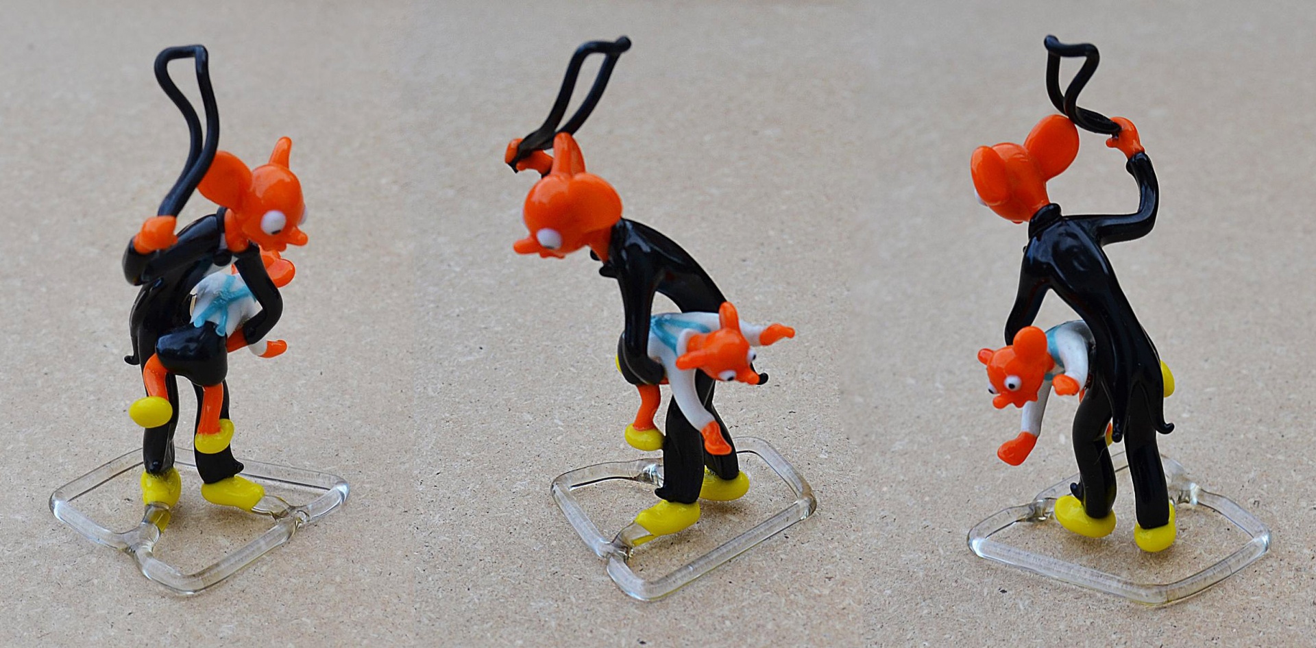 Skleněná figurka Spejbla trestajícího Hurvínka (J. Brychta, cca 1955)