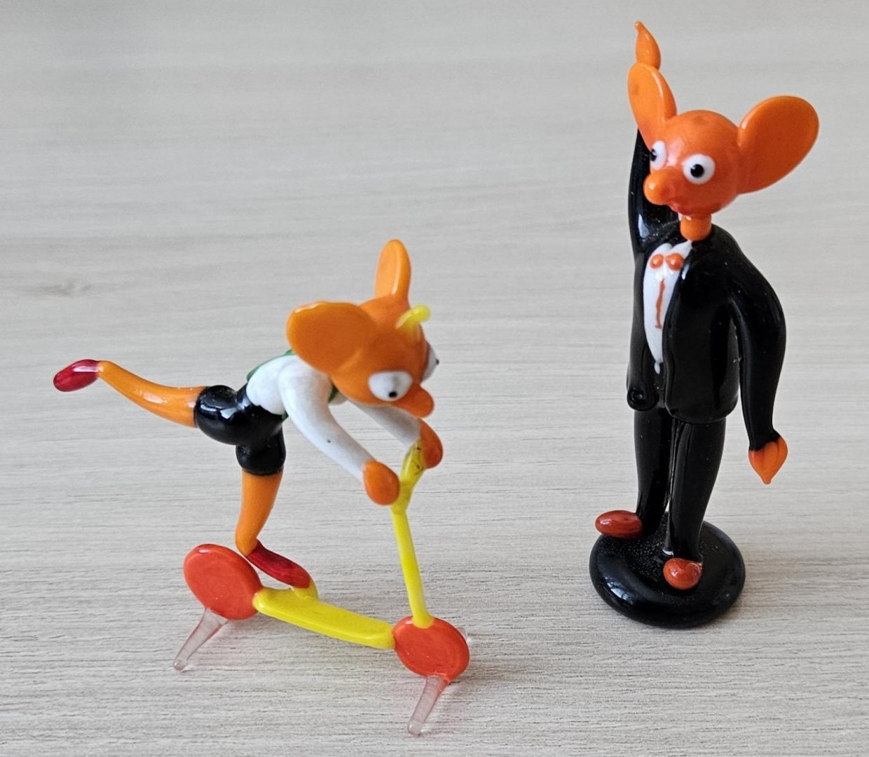 Skleněné figurky Hurvínka na kolběžčce se Spejblem (výška Spejbl 70 mm, Hurvínek 55 mm)