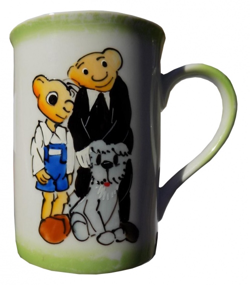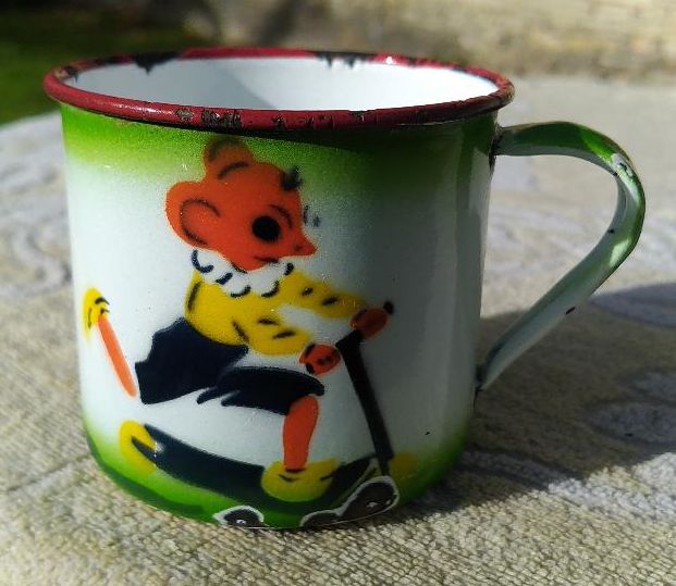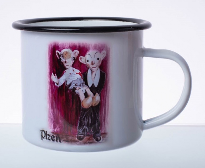 Ručně malovaný hrnek s Hurvínkem se zlatým lemem z druhé poloviny 20. století (výška 7 cm, průměr okraje 7 cm, na opačné straně obrázek mochomůrky, výrobce: Karlovarský porcelán n.p., porcelánka Lesov).