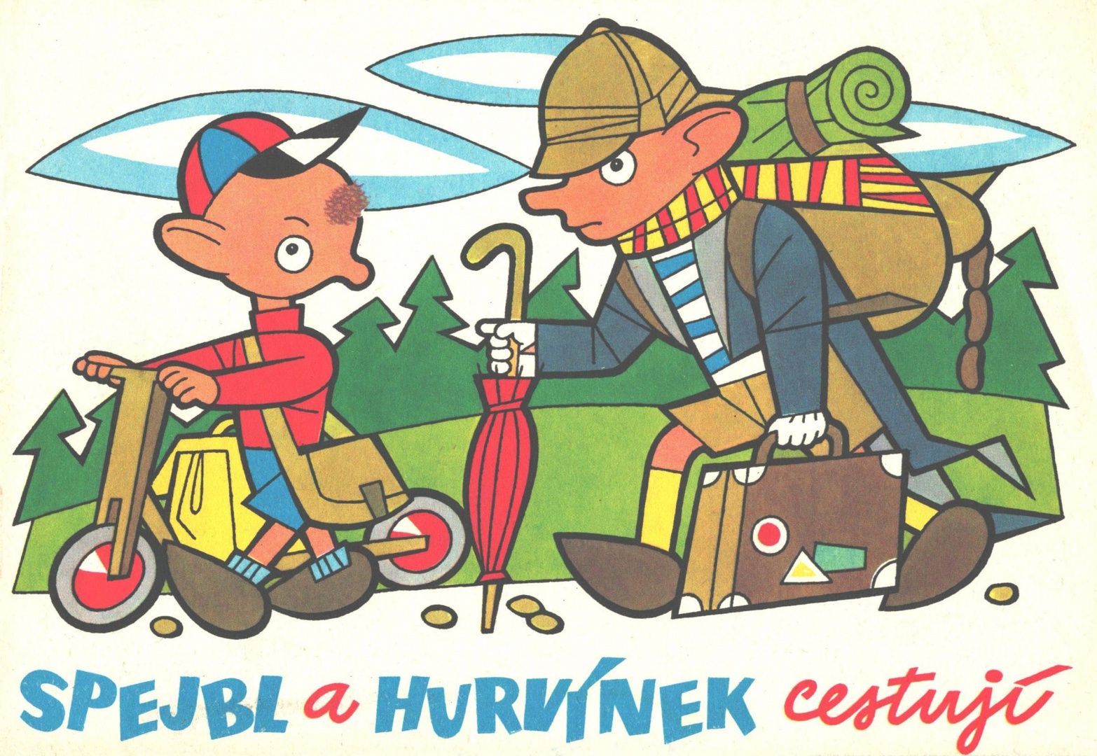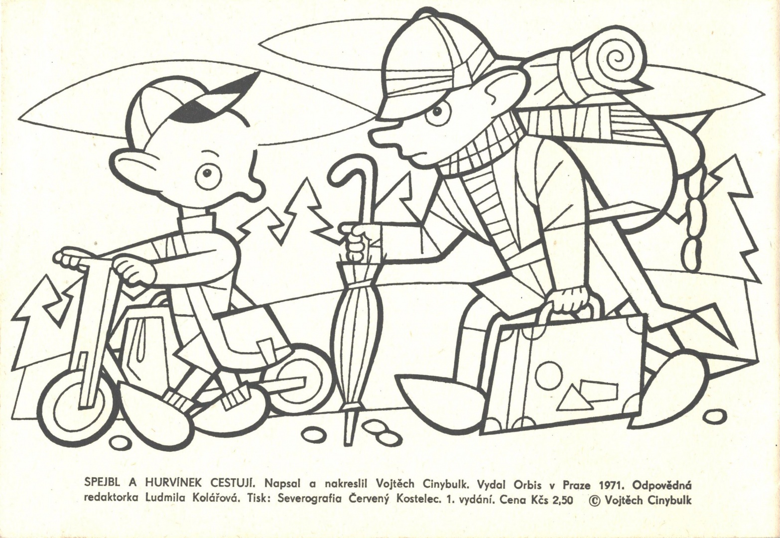 Nakreslil: Radko Haken. Redakce: K. Kulendík a O. Prouzová. Vydalo vydavatelství ČTK-PRESSFOTO, Žirovnická 2389, 106 00 Praha 10. Tisk ČTK-REPRO, č.2-2-287/699, 16 stran. - Omalovánky Spejbl a Hurvínek cestují (1971)