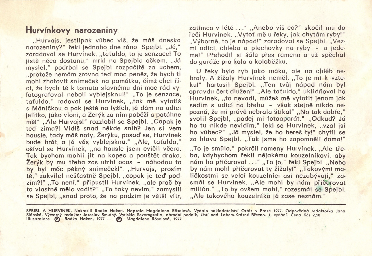 Nakreslil: Radko Haken. Napsala: Magdalena Röselová. Oprávněná redaktorka: Jana Slánská. Výtvarný redaktor: Jaroslav Smutný. Vydalo nakladatelství Orbis v roce 1977. Vytiskla Severografia Ústí nad Labem-Krásné Březno. Cena: 2,50 Kčs, formát A5, 16 stran - Omalovánky Spejbl a Hurvínek (1969)