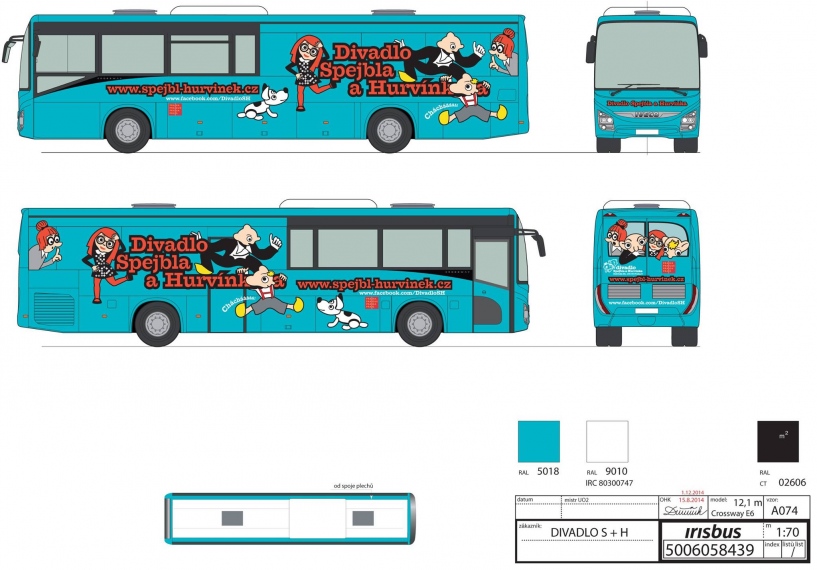 Nakreslila Naďa Sotáková, vydalo vydavatelství Jiří Komárek, JIKO Jičín, formát A4, EAN: 8594015911564 - Model divadelního autobusu Iveco Crossway Pro (2015) - ke stažení zde (pdf)